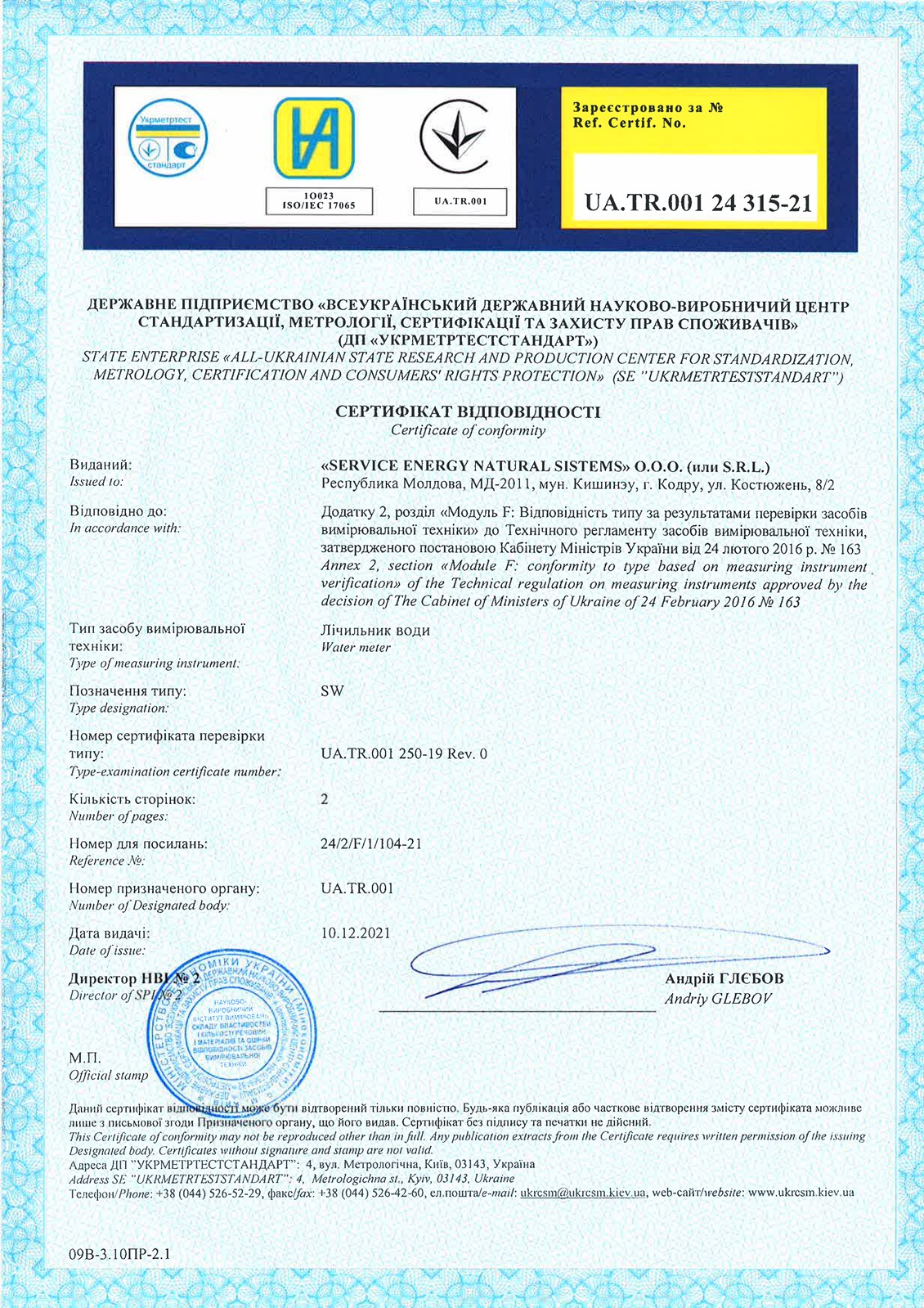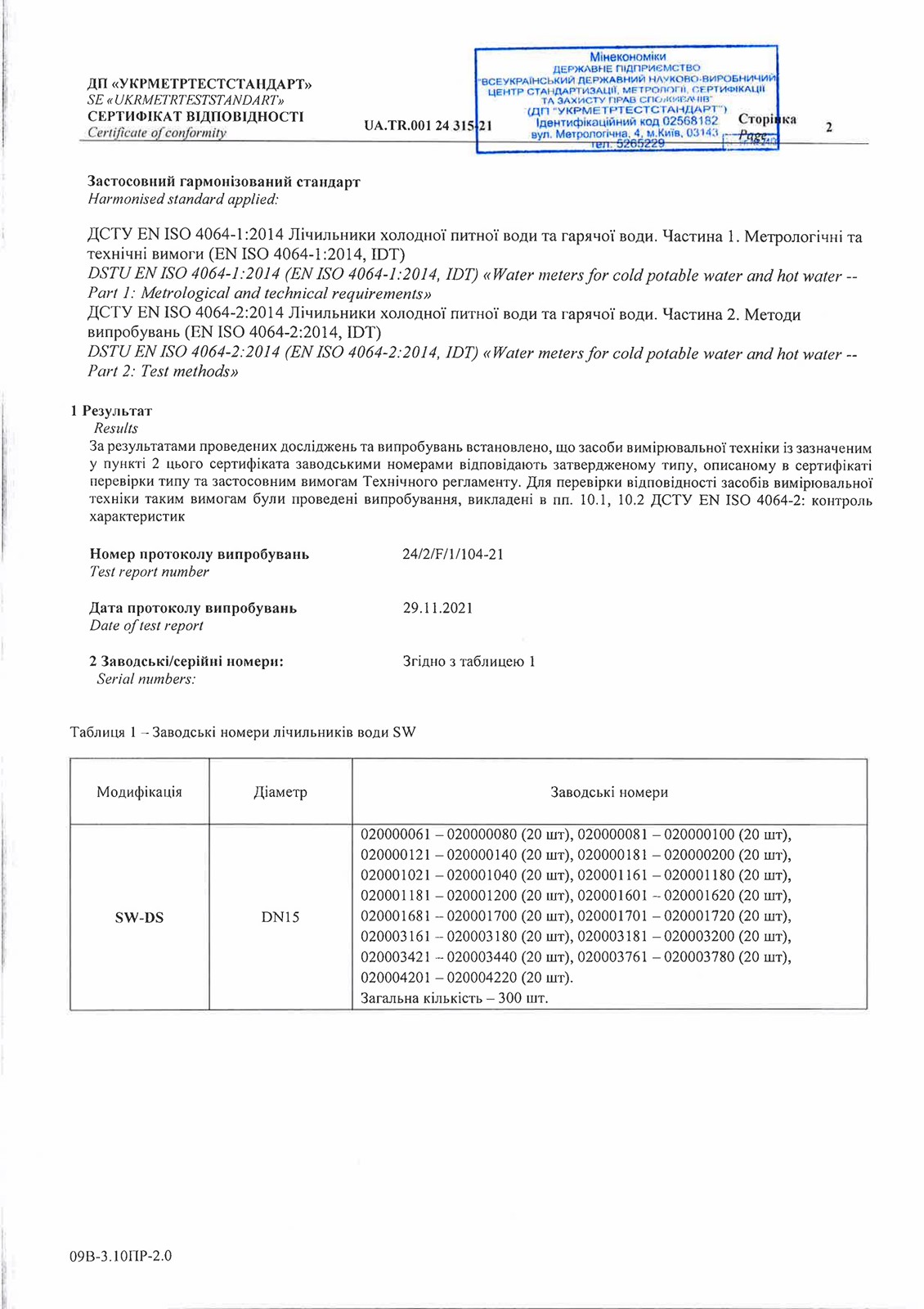 СЕРТИФІКАТ ВІДПОВІДНОСТІ: UA.TR.001 24 315-21